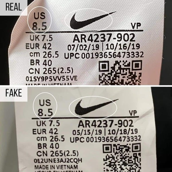 Tag nằm bên trong giày chứa các thông tin về sản phẩm như thông tin nhãn hiệu, size…và đặc biệt quan trọng mã UPC…giúp nhận biết tính chính hãng của sản phẩm. Ngoài ra bạn cũng có thể dựa vào chất lượng logo, font chữ…trên tag giày để phân biệt vì những chi tiết này tuy nhỏ nhưng được quy định rất nghiêm ngặt.