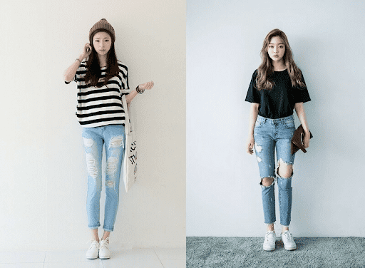 Cách phối đồ Slay này sẽ là lựa chọn tuyệt vời cho những cô nàng yêu thích sự thoải mái. Tuy nhiên để không bị lu mờ, hãy chọn một chiếc quần jeans có chi tiết độc đáo như rách, cắt xẻ hoặc đính kèm các phụ kiện để tạo điểm nhấn. Kết hợp với một chiếc áo thun basic màu trắng hoặc đen để giữ cho trang phục cân đối và tinh tế.