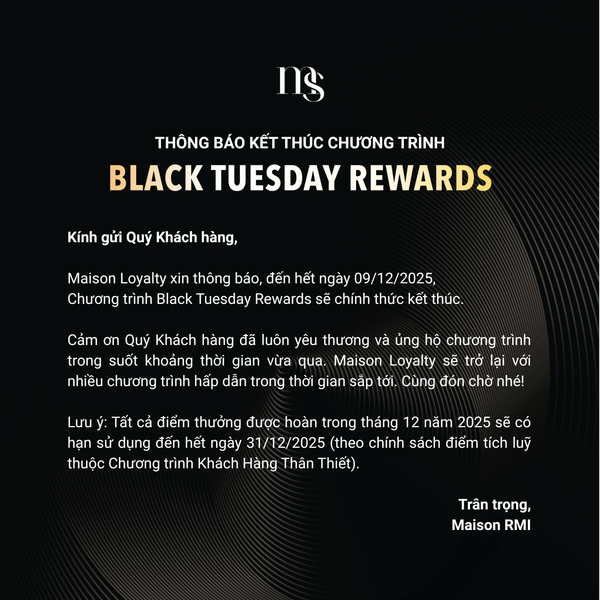 Chương trình Black Tuesday Reward sẽ kết thúc vào cuối ngày Thứ Ba, 09/12/2025. Toàn bộ điểm tích hoàn từ chương trình sẽ có hạn sử dụng đến ngày 31/12/2025 (Theo chính sách điểm tích luỹ thuộc Chương trình Khách Hàng Thân Thiết).